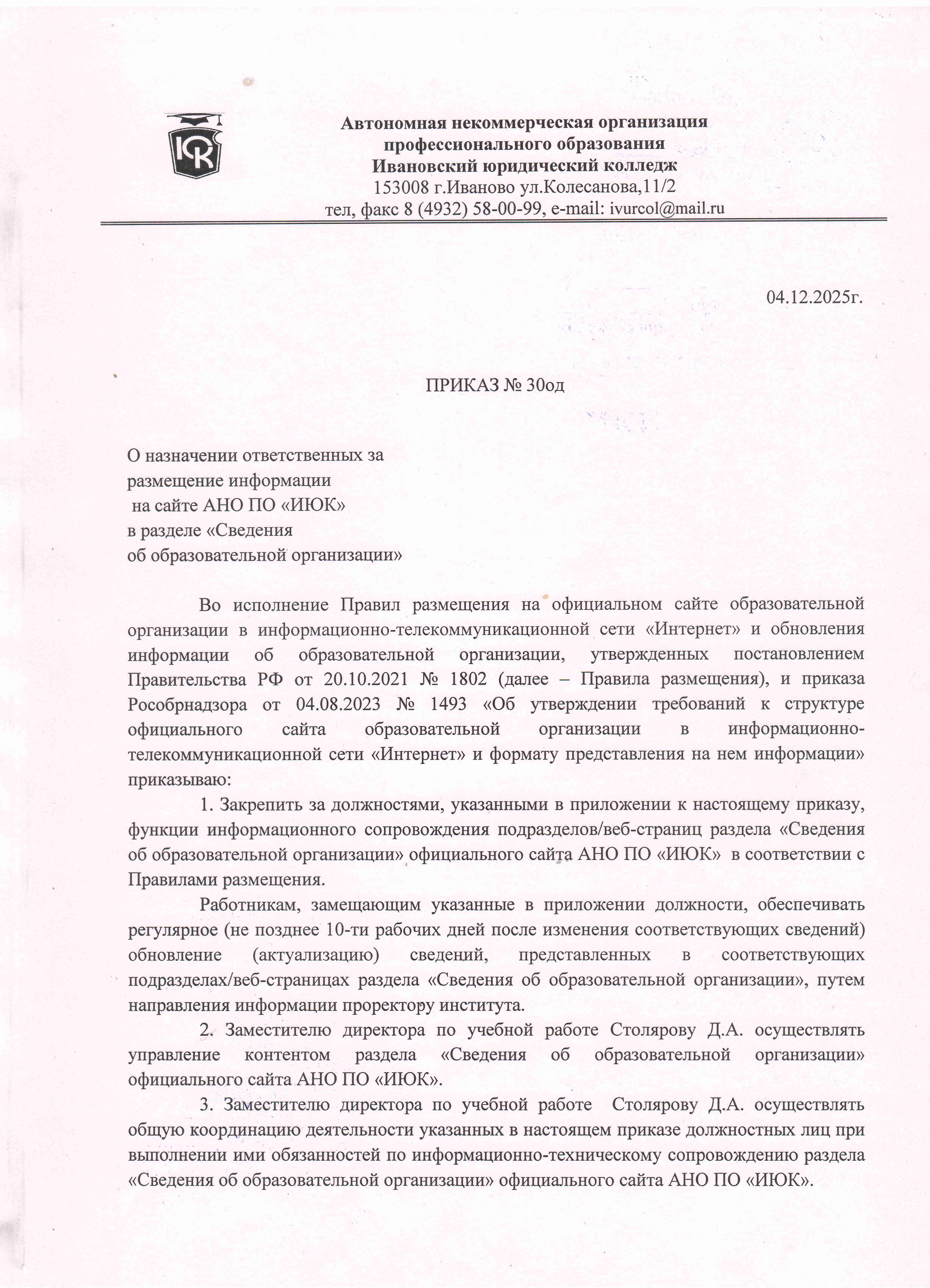 • ПРИКАЗ О НАЗНАЧЕНИИ ОТВЕТСТВЕННОГО ЛИЦА ЗА ВЕДЕНИЕ ОФИЦИАЛЬНОГО САЙТА КОЛЛЕДЖА